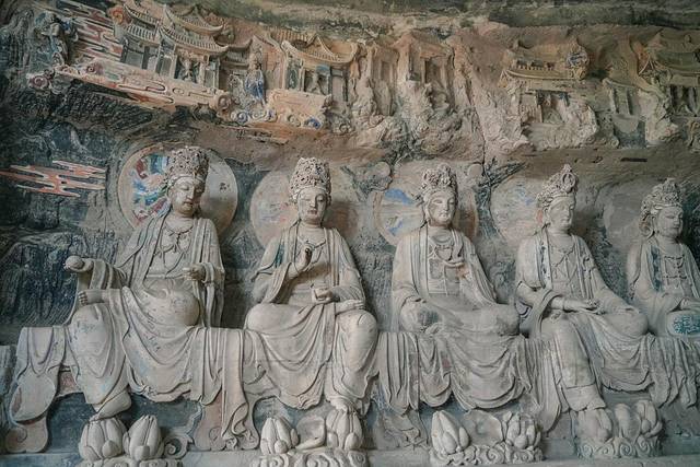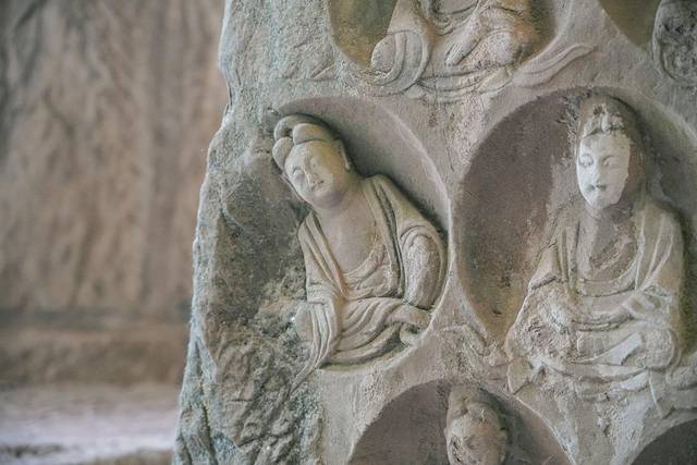 在正中间雕刻了“西方三圣”坐像,由阿弥陀佛,观世音菩萨,大势至菩萨构成。因为年代久远,以前的文物保护技术不够,现在看到的石刻造像,很多都被风化了。