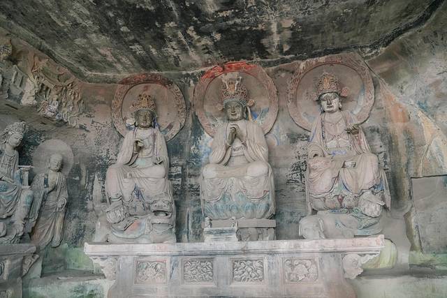 这一窟石刻造像在全国仅有两窟,一窟在安岳毗卢洞,一窟在大足。但安岳石刻比大足石刻早了大概400多年。
