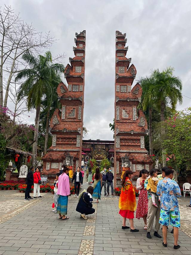 人造景区巴厘村,很多人穿着印尼服饰拍照