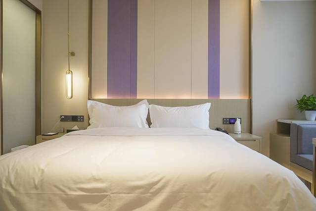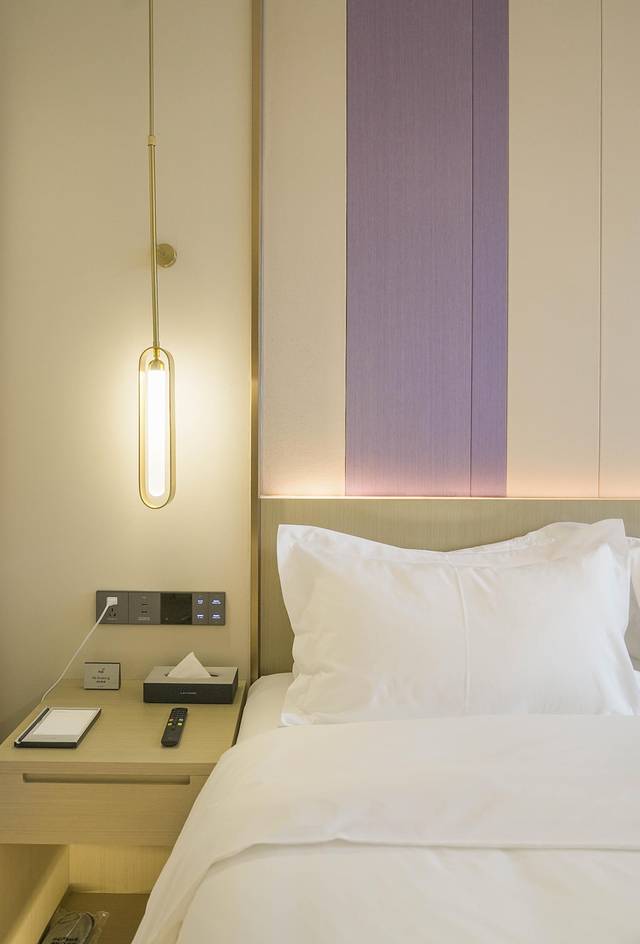 房间整体是简约无压色调设计,床头运用了紫色加米白色的设计,紫色作为跳色增加了些时尚的气息。