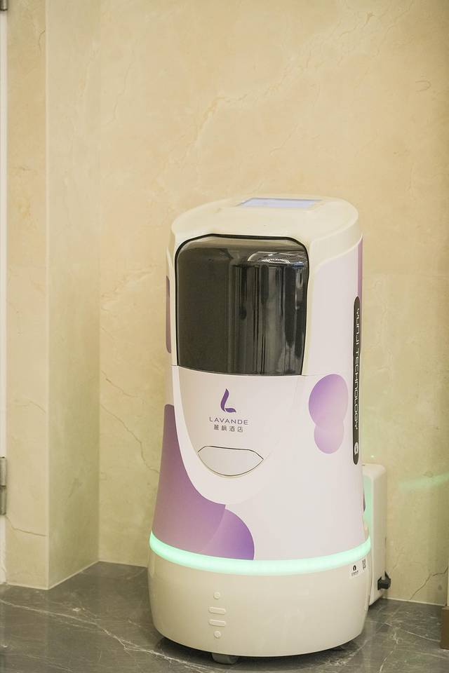 在大堂还有一个随时待命的送物机器人,我在房间点的外卖就是由它送到我手里的。