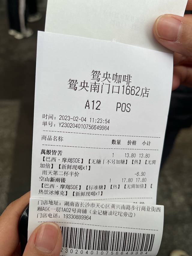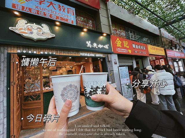 有吃的,喝的必须也要安排上,在这附近有家鸳央咖啡(店员说他们跟茶颜悦色是一家,所以来试试味道,推荐来喝,我点的万般皆苦13.8 空山新雨后17.8.这里由于第二杯半价,万般皆苦只用了6.9)