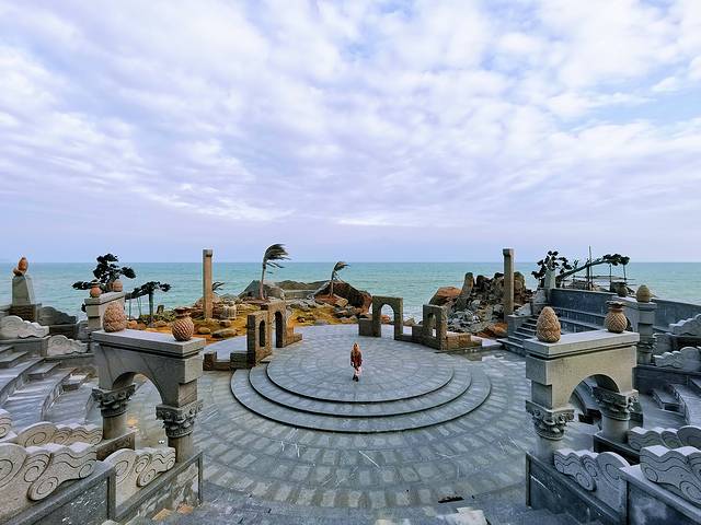 🏰古堡,这个景点在地图中未标注。回到风约亭,继续向前走,会先看到分界碑。继续沿着车道走,遇到大的分岔路口,向右继续走,经过海豚客栈及直升机,沿着海边道路,就到了古堡。非常适合无人机拍摄。