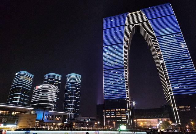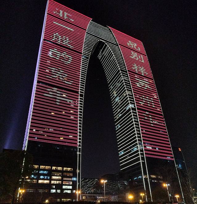 地铁1号线在东方之门出来就看到苏州地标大裤衩,晚上连片的灯景很漂亮。7点半有金鸡湖喷泉,不过不是天天都有,想看先查查周几有。金鸡湖超大跟西湖有一比,夜景很美,远眺沿岸的繁华灯光别有一番景象。白天去的话估计没晚上灯光旖旎的好看。