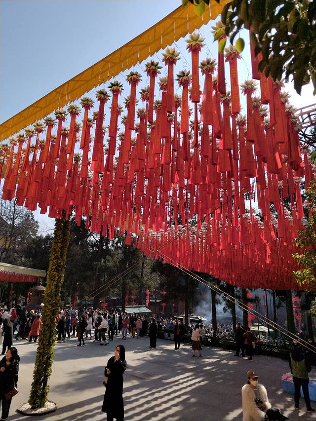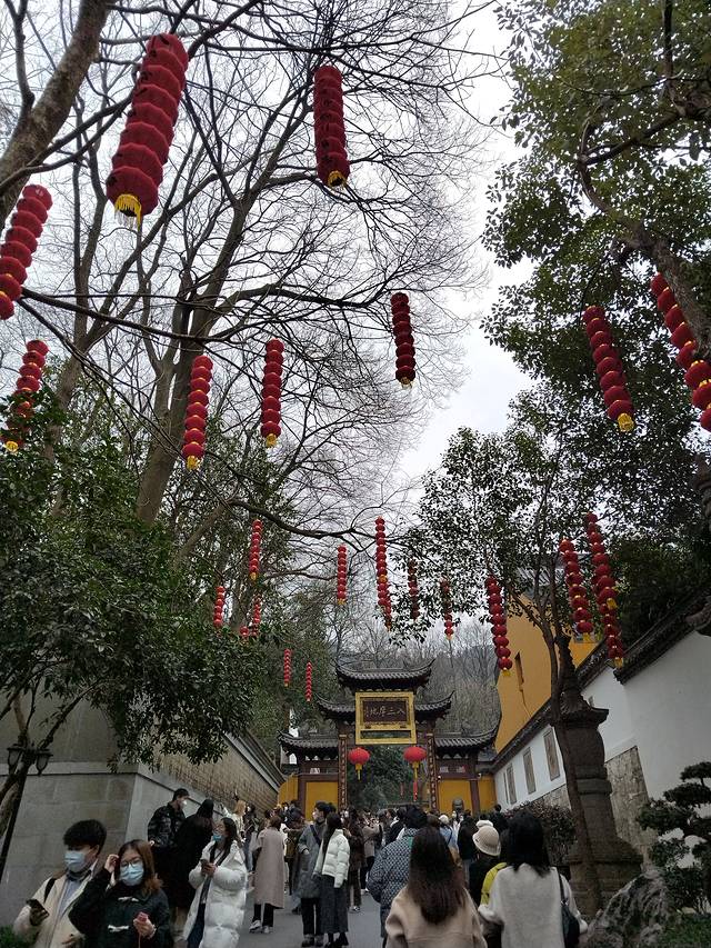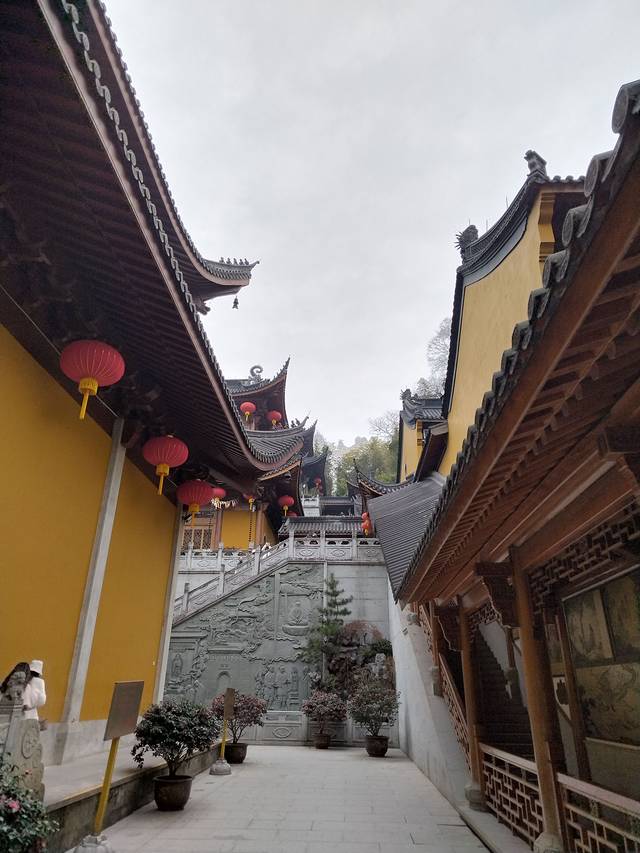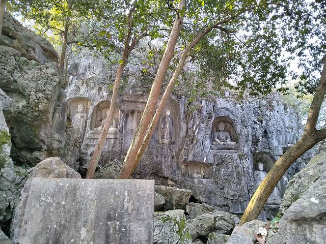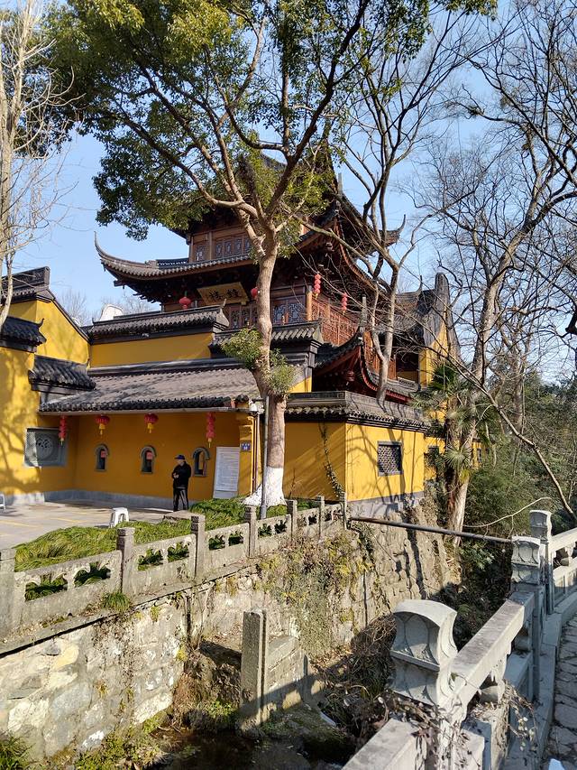 直接滴滴去灵隐寺,途中会绕西湖北面恰好观赏了昨天没去到的北山街,路两边都是巨大的光秃秃的法国梧桐,等叶子长出来应该别有一番风情。内部道路有权限,原来滴滴车是不能直接开到灵隐寺的,误打误撞的我们坐到梅灵路法镜寺下车,步行穿过天竺路,一路会看到很多纪念品小店网红店饮食店(如果坐观光车就无法步行体验了,后面会说观光车),走尽就到飞来峰造景和灵隐寺。灵隐寺巨多人,我们打个卡烧个香就出来去飞来峰,当然如果有时间还可以去韬光寺看看,不想爬山的去山脚缆车站搭缆车上山,缆车上顺便打卡西湖龙井大片茶田,但其实飞来峰不算高,不怕累也可以爬上去!由于太多人光排缆车队就要两小时我们果断放弃飞来峰(主要是觉得没啥看头)直接去法喜寺!