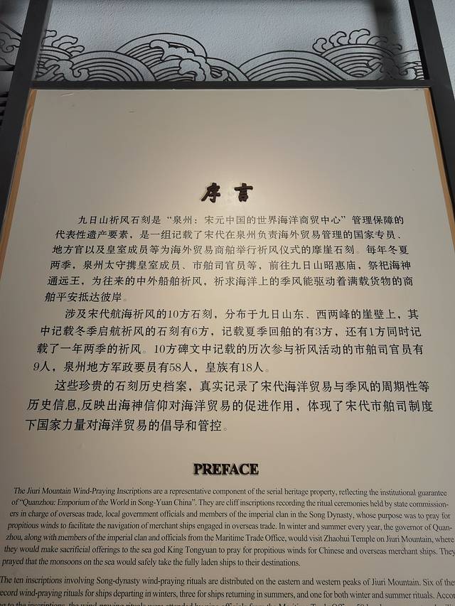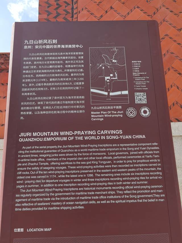 2021年7月25日,泉州:宋元中国的世界海洋商贸中心”由第44届世界遗产大会审议通过,成功被列入《世界文化遗产名录》,成为中国第56处世界遗产,九日山祈风石刻是22处代表性古迹遗址之一。