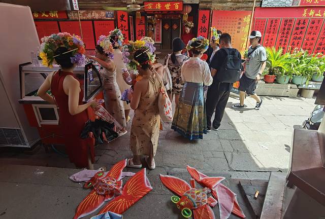 蟳埔女的装饰被称为‘封建头、民主肚’:它的头发在脑后梳成圆髻,髻中横穿一支“骨髻”,插上几朵五颜六色的鲜花,再盘上几串四时鲜花,嫣紫姹红、争芳斗艳;它的服饰是典型的“大裙衫、阔脚裤”,且盛行“青衫黑裤”;其所佩首饰以“丁香”较具特色,据传蟳埔女的头饰及“丁香”存有泉州“海丝”的遗踪。当地的村民还是这样的打扮的。