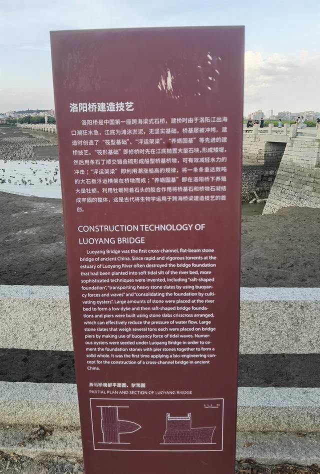 洛阳桥使用一种直到近代才被人们所认识的新型桥基──“筏形基础”;所谓“筏形基础”,就是用船载石沿着桥梁中线抛下大量石块,使江底形成一条矮石堤,然后在堤上建桥墩; 洛阳桥桥墩全中用长条石交错垒砌,两头尖,以分水势,减轻浪涛对桥墩的冲击;为了巩固基石,中国古代劳动人民还首创了“种蛎固基法”,即在基石上养殖牡蛎,使之胶结成牢固的中流砥柱,这是世界上把生物学应用于桥梁工程中的先例,仍可以从那些缀满白色蛎房痕迹的桥墩石 ,洛阳桥的建造,使洛阳江天堑变通途。