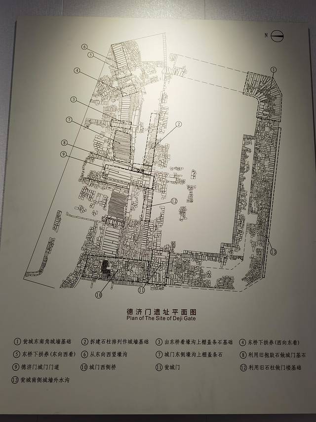 德济门遗址坐北面南,面积近2000平方米,由早期城垣遗迹、内濠沟、古拱桥、德济门城垣、月城(瓮城)城垣、外濠沟等遗迹组成。