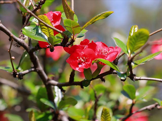 当春回大地,满山贴梗海棠争相怒放,灿若红霞,蔚为壮观。“圆通人道樱花艳,昙华我著海棠红”。