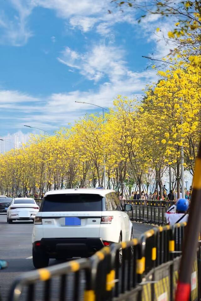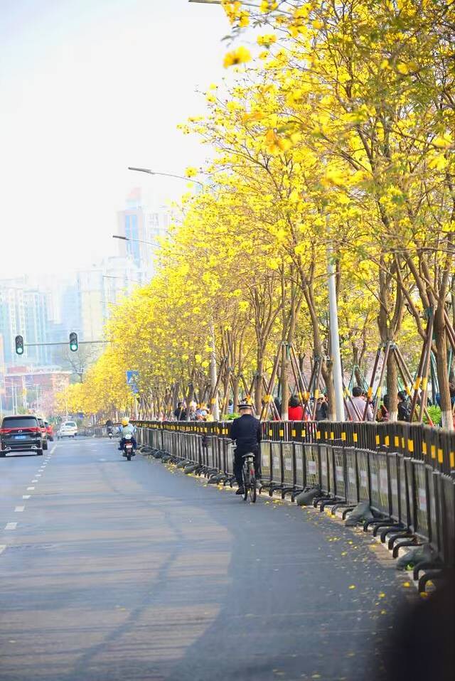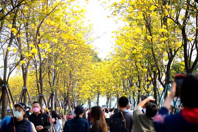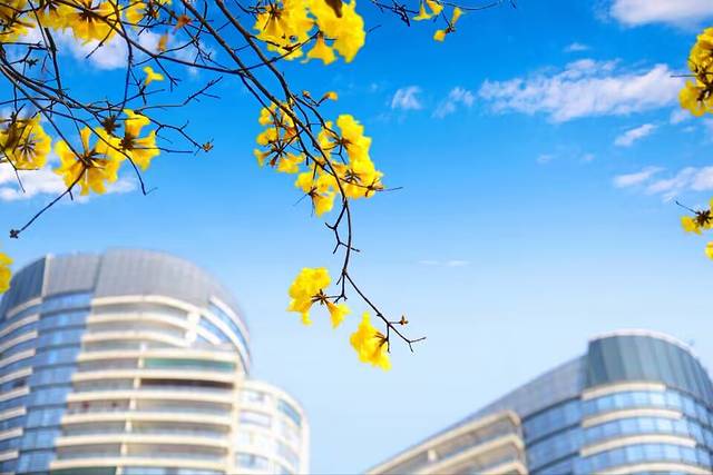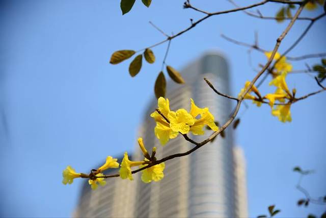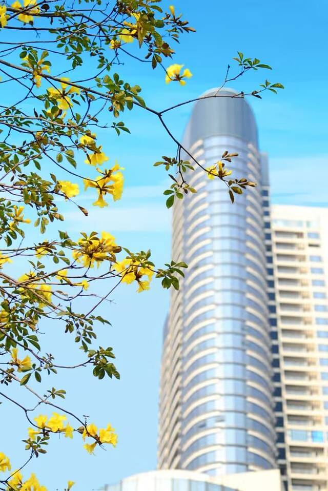一夜之间,广州的黄花风铃木悄然绽放。连片的黄花,自带滤镜,与背后林立的高楼大厦,组成一幅“半边黄花半座城”的春日限定春景图,“花”“城”二字,展现得淋漓尽致。