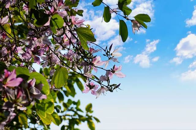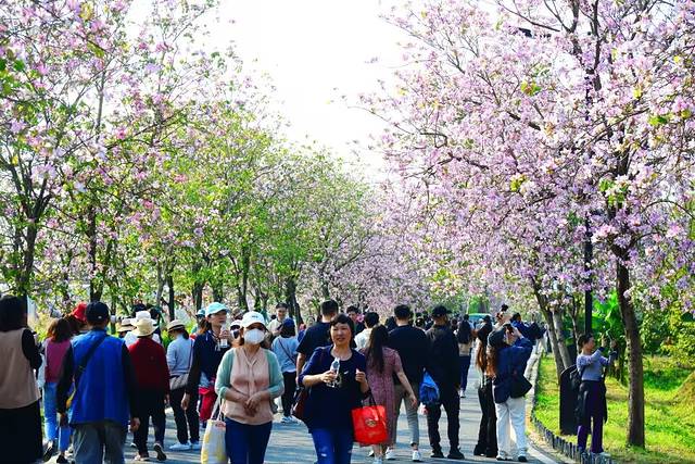 广州市海珠湿地数千株宫粉紫荆争相怒放,共同绘制成一场长达3.2公里的粉色梦境。作为湿地的颜值担当之一,宫粉紫荆远看像雨像雾又像风,仿佛童话仙境。花开时节,粉白相间蔚为壮观。