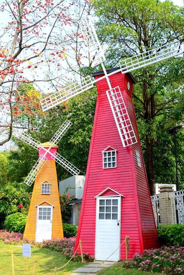 绚烂灵动的花境、花带错落分布于林下、溪边、小路旁,各色花卉尽态极妍。沿着台阶拾级而上至顶部有一个开阔的小广场,广场后面就是一池湖水,名叫滟湖。湖面呈蝴蝶形状,北端有一直径为30米的圆形喷泉。