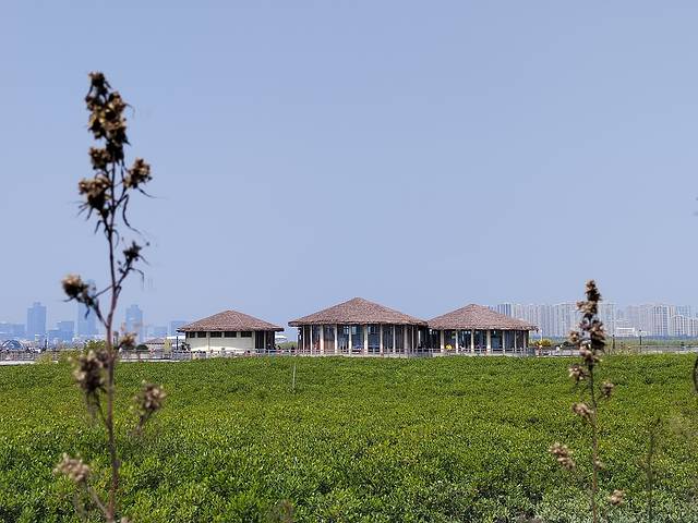 站在公园的马路边上,拍摄公园内的红树林及园内的休闲屋。