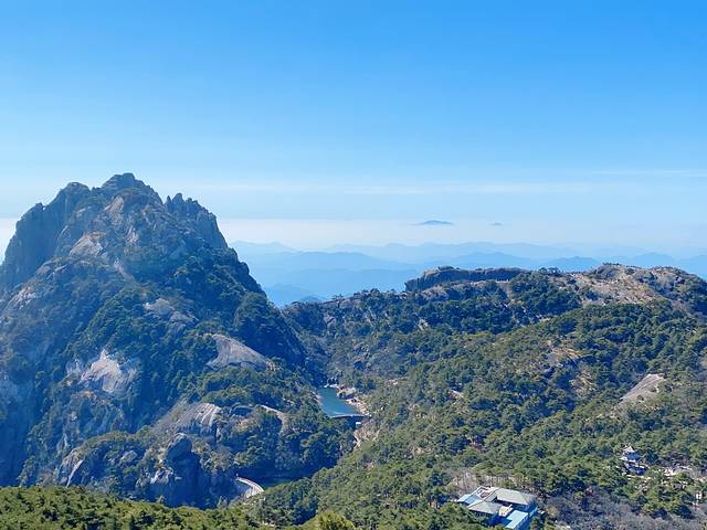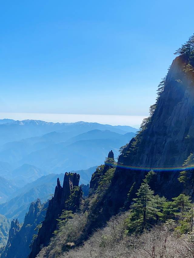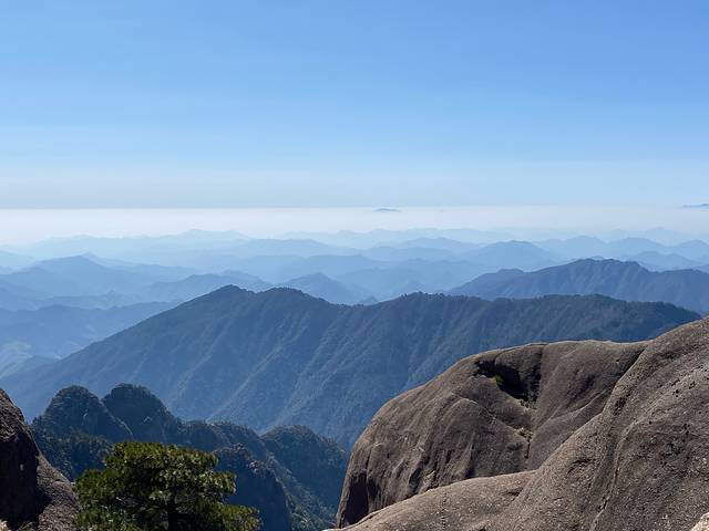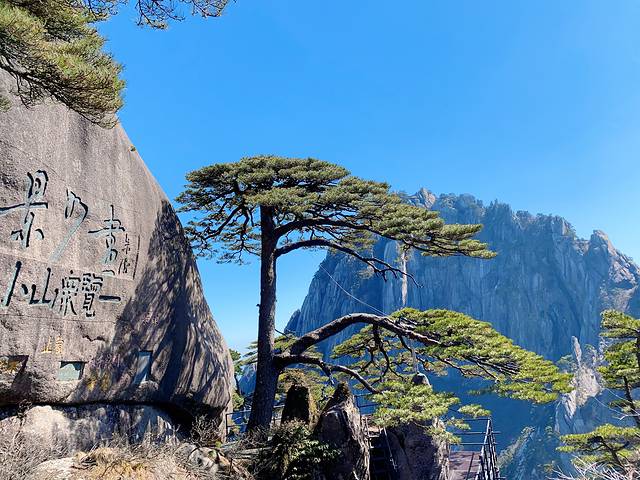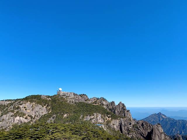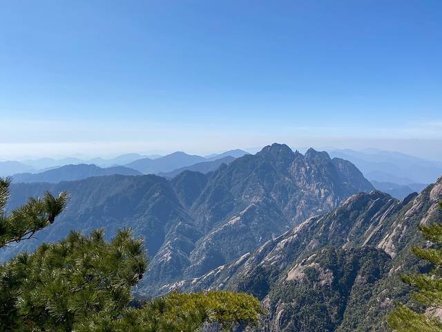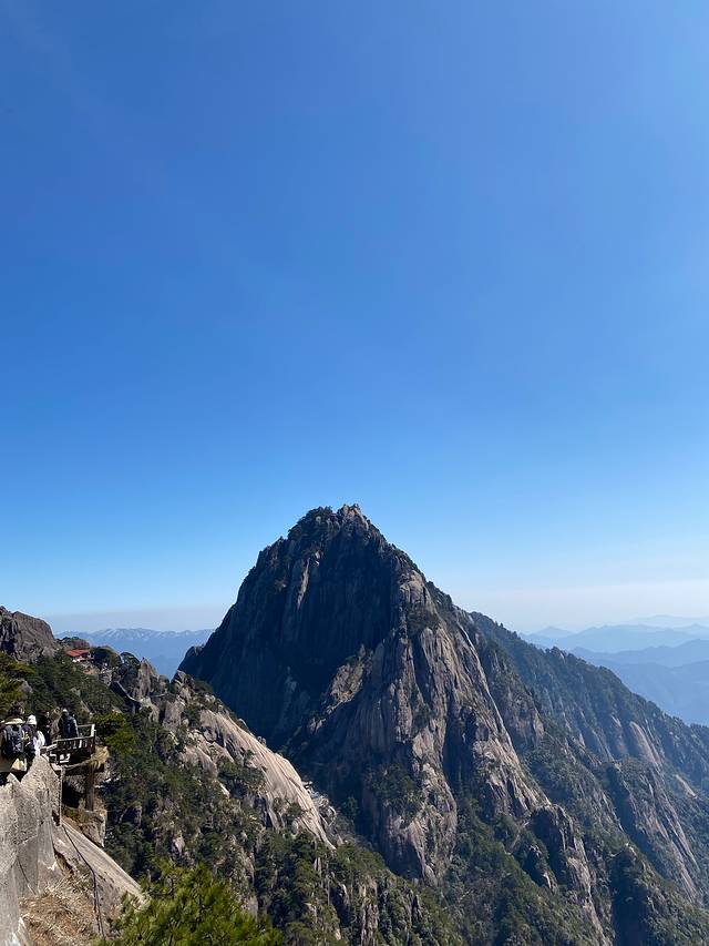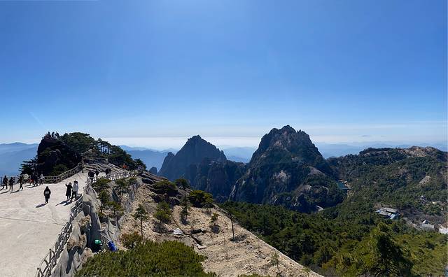 退完房收拾好行李之后就开启了返程的旅行。并前往迎客松。这段路也是先到达光明顶,经过鳌鱼峰,鳌鱼洞、莲花洞最后来到迎客松景点。这段路大概走了有三个多小时。因为天气好的原因,来的人特别的多,旅行团好几个。因此在狭窄的山路上显得特别的拥堵。对于我这种恐高性选手来说,是一种特别难受的体验。路上还碰见前面的小姐姐和我一样恐高,被我一说吓得腿都软了,立马蹲下,扶着旁边的栏杆。因为天气好的原因,天空显得特别的蓝,加上迎客松本身的绿色。整个拍出来的照片特别的美,特别的亮。