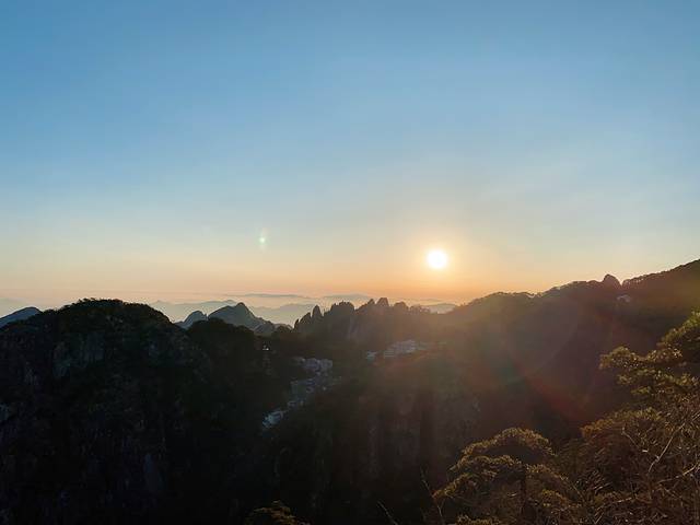 周日早上,起床全身都有些酸痛且特别的疲惫,加上当天的天气显示为阴天,所以本来预计看不到日出的。后来老朱说他要出发去看日出。而我们也就一块儿披上大衣就跑出去了。老朱可能还因为没有导航的原因走错了,没有上到丹霞风。我们闲人几个?跑到丹霞峰。虽然没有看到日出时候的过程,但是也看到了。太阳出生时照在黄山群峰上的美丽景象。和前一天严重的雾凇有着截然不同的美。