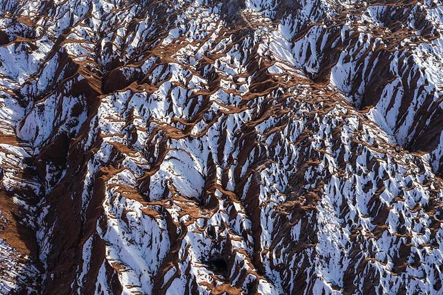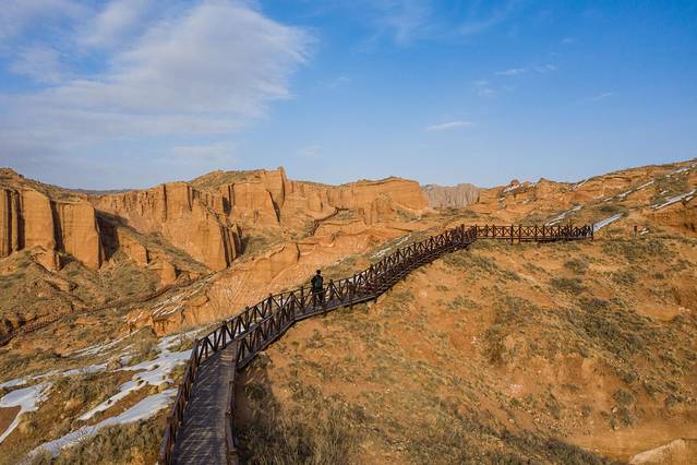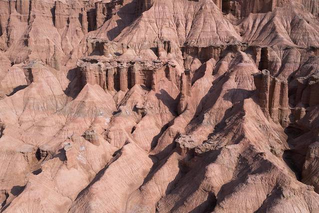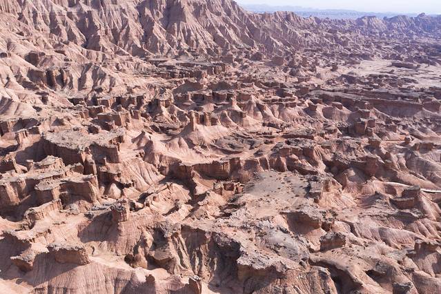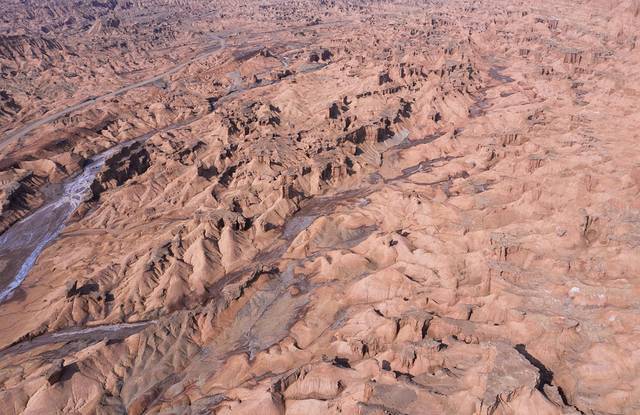 在蜿蜒曲折、大大小小的沟壑中,褐红色、黄绿色、灰绿色的土包层层叠叠,犹如荒废的古 罗马 城。