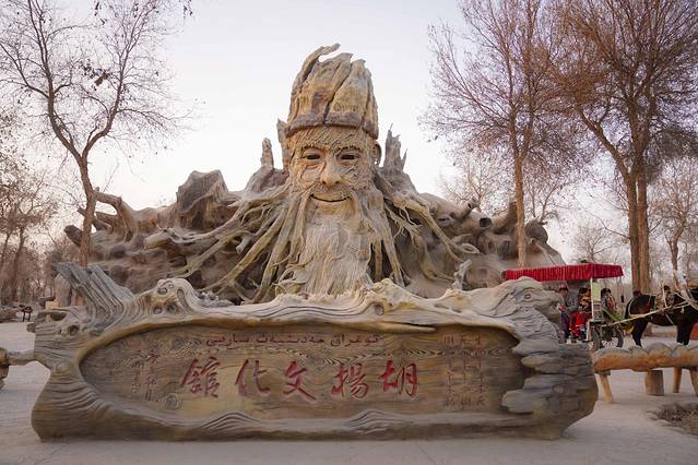 景区内有一座胡杨文化馆,外观巨大的胡杨守护神格外逼真显眼,慈祥的样子和蔼可亲,在馆内可以了解到许多关于胡杨的知识。