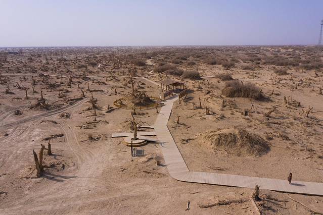 睡胡杨谷景区位于第一师 阿拉尔 市南方20公里的大漠深处,6.8万亩 塔里 木原生胡杨标本库呈东西条状分布,有直立、斜刺、横卧,形态各异,争奇斗异。大片的胡杨因只有躯干,没有树皮和枝叶,虽睡犹醒,故得名“睡胡杨谷”。
