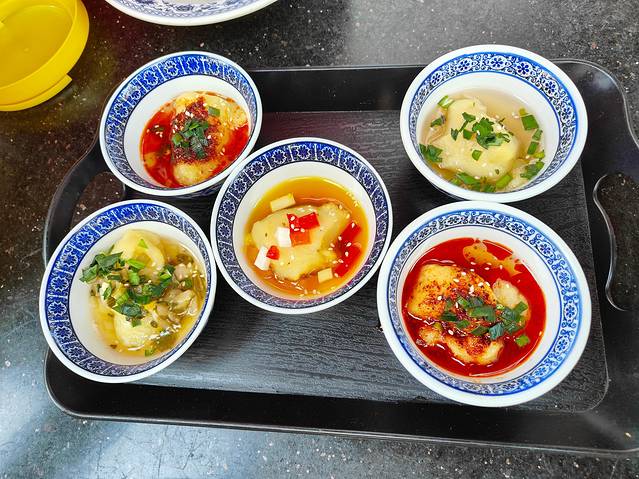 五种口味,中间那碗甜的,口感很特别,糯糯的但是没什么嚼头,一般