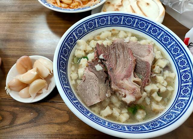 我这次旅行最期待的美食,羊肉泡馍,很怕踩雷所以特意找的一家人多的,店里满满的客人都是拼桌的,价格也很吓人,这碗优质羊肉泡馍得47左右,配一碟腌蒜