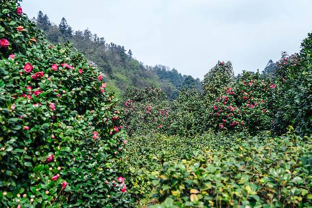 这里成片的山茶花以粉色为主,偶有几颗白色的茶花树点缀其中。山茶花开,枝密叶茂,花繁艳红的。