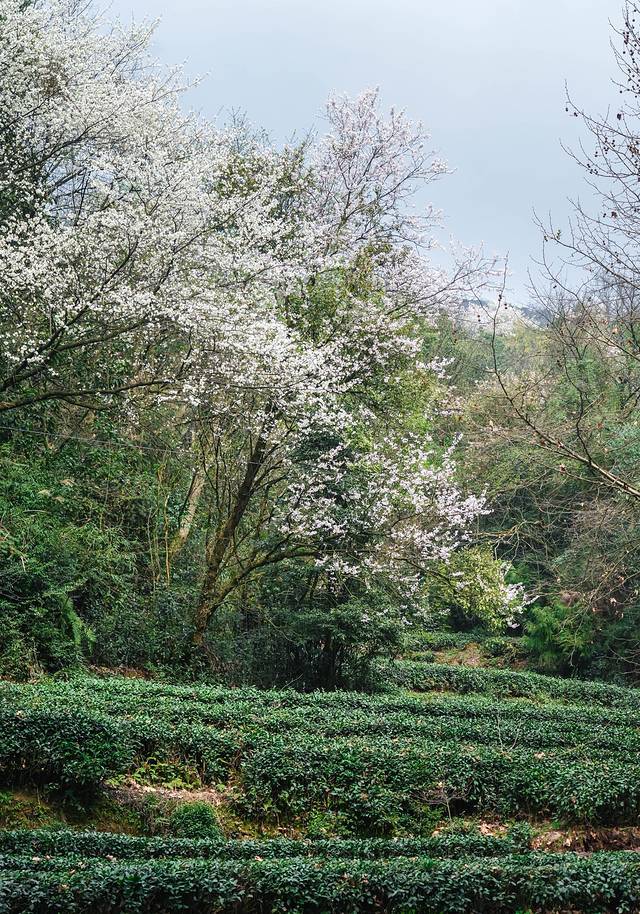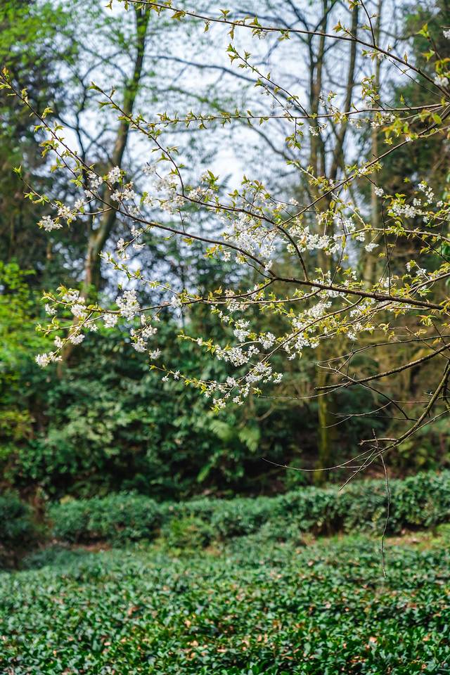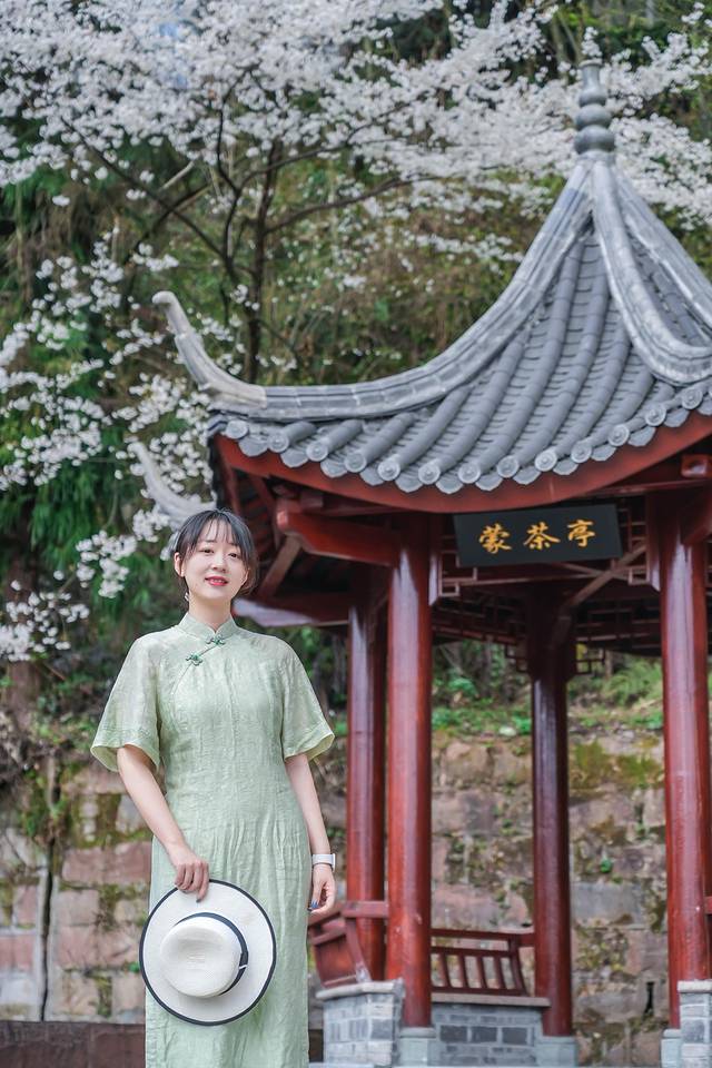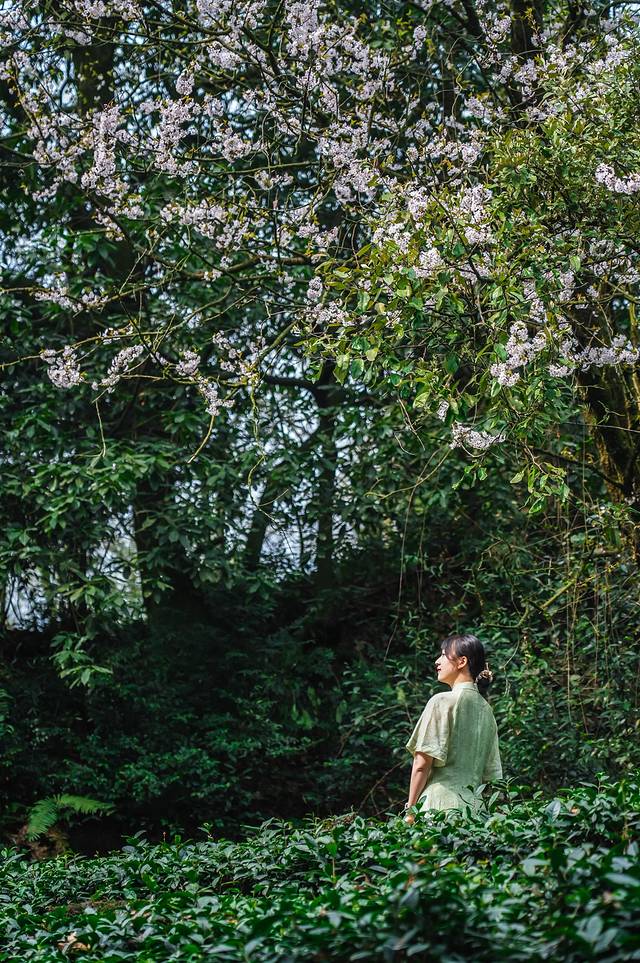 到了蒙顶山,一下就被大片茶园和樱花给美到了。白色的樱花挂在枝头,树下是延绵的茶园,一袭旗袍站在树下,时光都一下慢了下来。