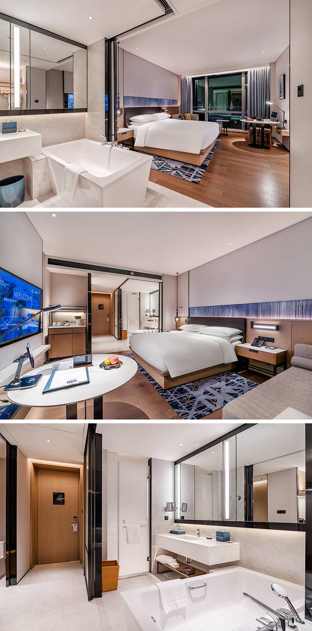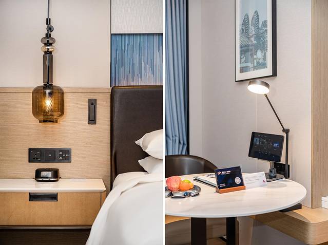 酒店拥有270间现代化设计风格的客房,暖木饰主色搭配蓝色点缀,带来如家般温馨舒适的氛围感。房间均配有休闲躺椅以及独立工作区,满足宾客的休息与商务的需求。透过落地窗能够欣赏到焦门河的景色,两岸风光尽收眼底。