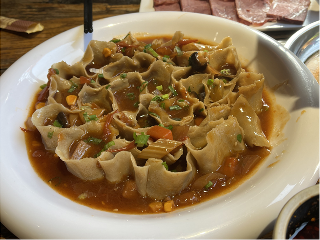 栲栳栳也是用莜面精工细作的一种特色面食小吃,上面还撒有一层牛肉碎,看着卖相粗糙,但有嚼头,口感劲道、汤汁浓厚,有乡土风味。