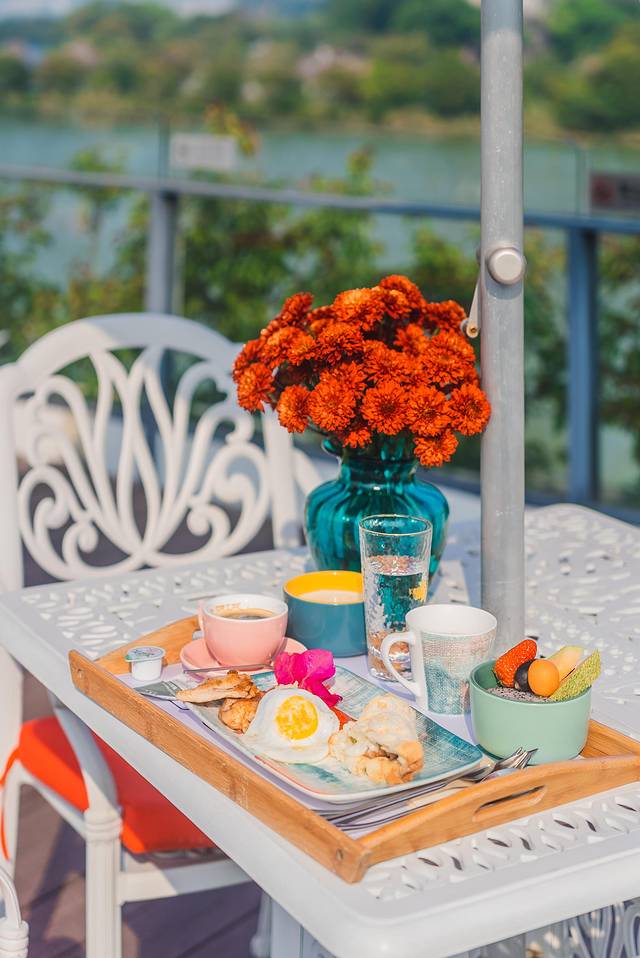 房间还有个面积颇大的独立阳台,在这里,可以独自晒晒太阳,享受私密的个人空间,也可以一家人一起沏一壶茶或冲一杯咖啡,享受眼前的悠闲。一边是星湖水、七星岩相伴,一边是茗茶、咖啡、美酒相随,当然再惬意不过了。