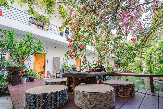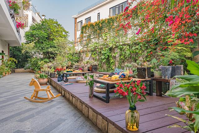 走进涟岸,外界的喧嚣戛然而止……庭院深深,开满鲜花,主人是爱花之人,几乎每个角落都布置了鲜花。此时的庭院中,正值炮仗花和勒杜鹃盛放的时候,客栈内巨型的勒杜鹃好像头顶上的红色瀑布。