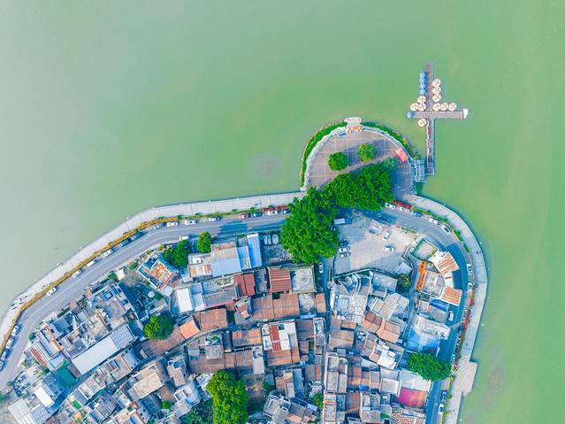 离水月宫不远处的五龙亭现在更加是现在肇庆市的标志性建筑,五龙亭的布局从航拍视角上一览无遗:一座长桥从湖边连接到五龙亭,中间一座八角重檐,四旁四座四角单檐,亭与亭之间有曲栏相接,就像浮于湖中心一样,于是被称为五龙亭。