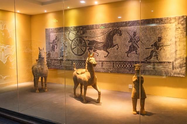 馆内的这个车马出行陶俑很精美,看着似驴非驴,和壁画上的一摸一样。原本还有一辆马车,可惜在地震的时候受到了损坏,目前还没有完全修复。