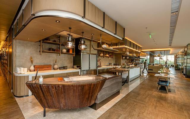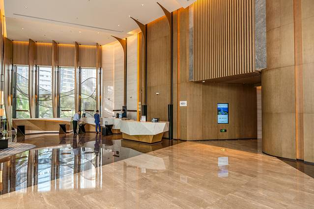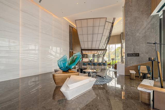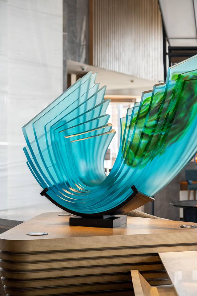 以自然和海洋为启发,酒店的设计从外观到室内,都采用了大量的海洋元素。从酒店的塔楼和裙楼的建筑外观,波浪型的线条设计与门口的水景雕塑《归屿》相呼应;大堂内独特的帆船艺术装置,则象征着锐意进取、扬帆起航的决心,而这些元素让酒店彰显灵动、精致。