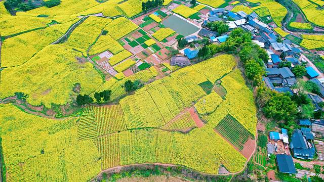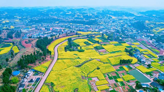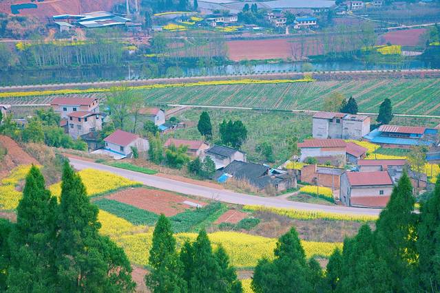 春天的田野都会被一簇一簇的油菜花装扮成金装,一阵清风徐来,大地上便掀起了片片的涟漪,散发出阵阵清香,招风引蝶。一排排纯白色的小楼房,四周环绕着金灿灿的油菜花海,虽不及婺源那般雅致秀美,却有着川东独特的乡村之美。
