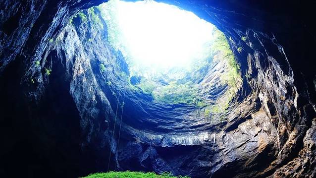 天坑好寻,进入却难,可在“凌冰洞天坑”,你可以头戴探灯,手持登山杖,进入一探究竟。
