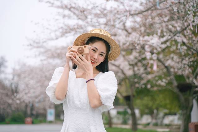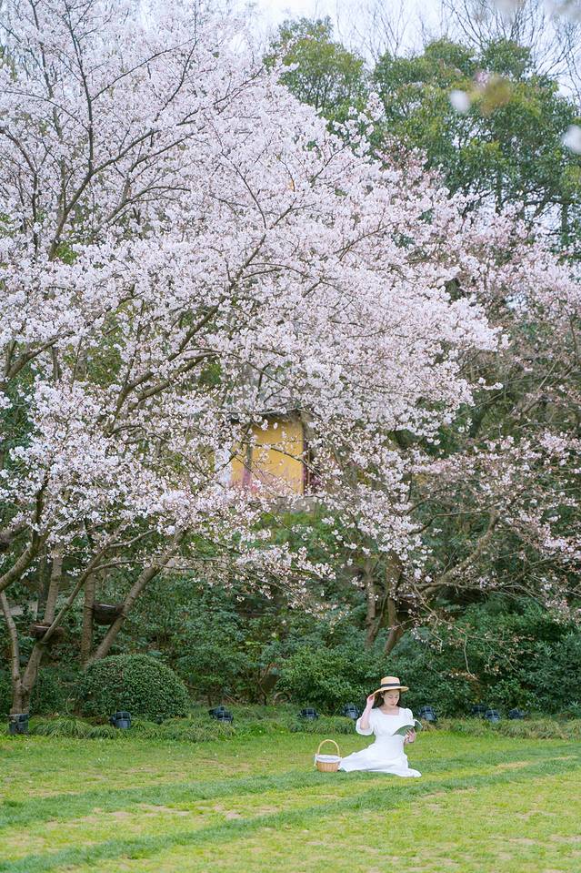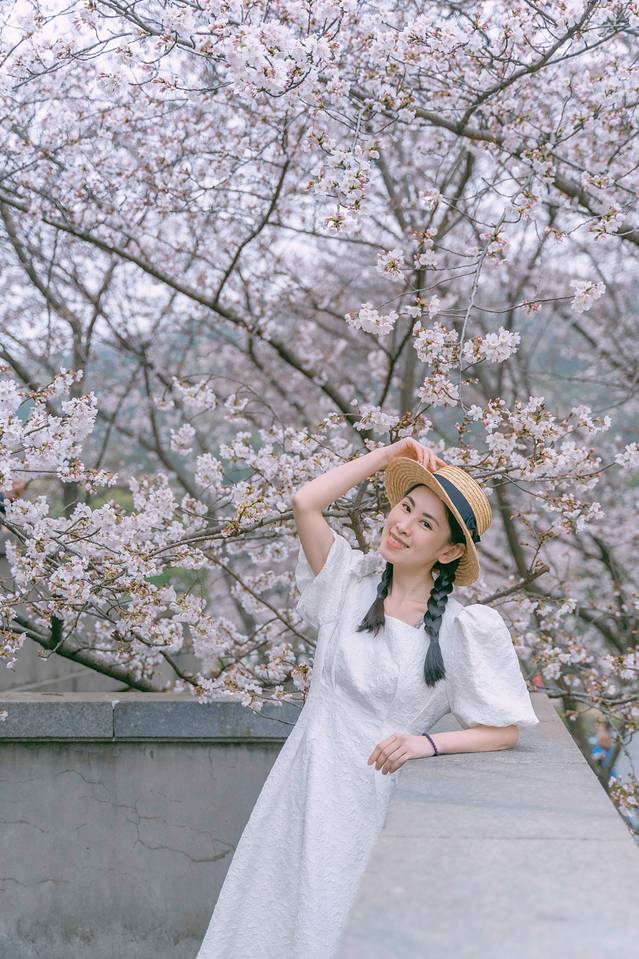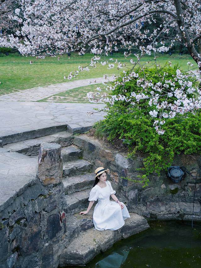 在这里,处处都是景,樱花树下的草地上,樱花树下池塘边的台阶上,一袭白裙,或坐或立,是那般的动人。