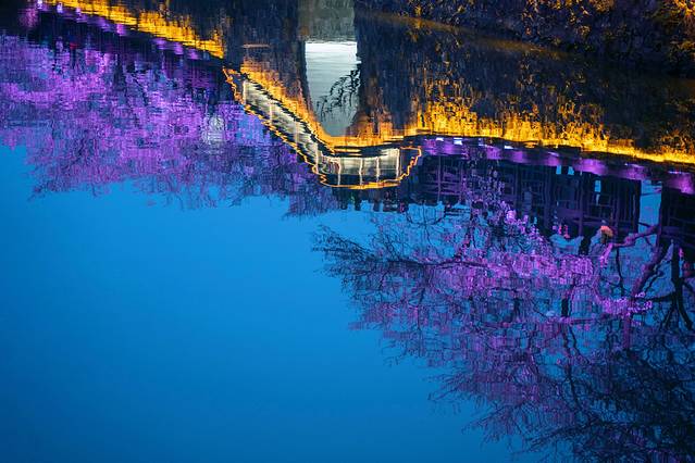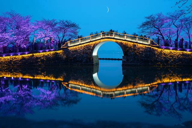 鼋头渚赏夜樱,主要也是集中在两个地方,分别是长春桥和樱花谷,长春桥是最为经典的夜樱观赏点。在这里,桥两旁的樱花被彩灯照亮,如梦如幻的场景倒映在平静的水面上,二者合一的画面让这里更加的美。