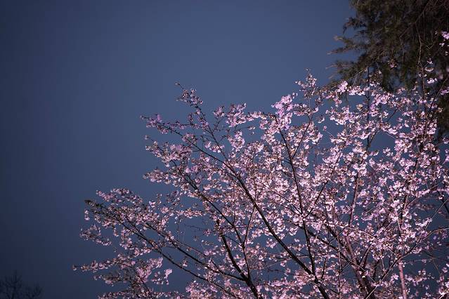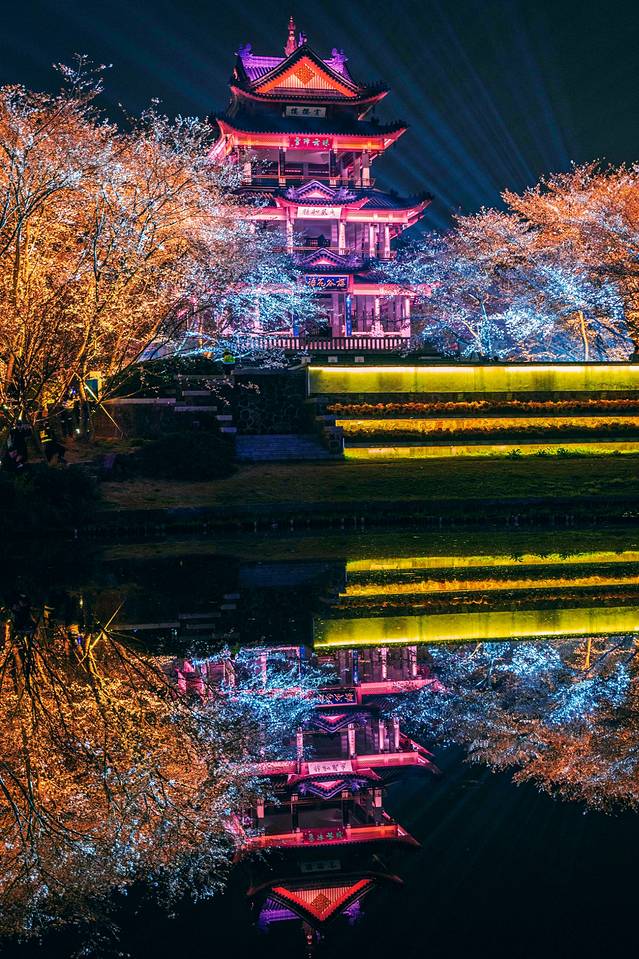 在蓝色的天空下,从樱花林到赏樱楼,沿路两旁的樱花与灯光相互辉映,宛如置身仙境一般。灯下赏樱 ,月下漫步,在春风沉醉的夜晚,邂逅满树芳华。