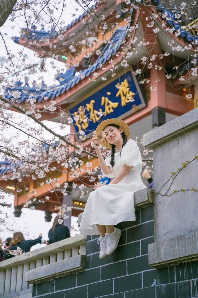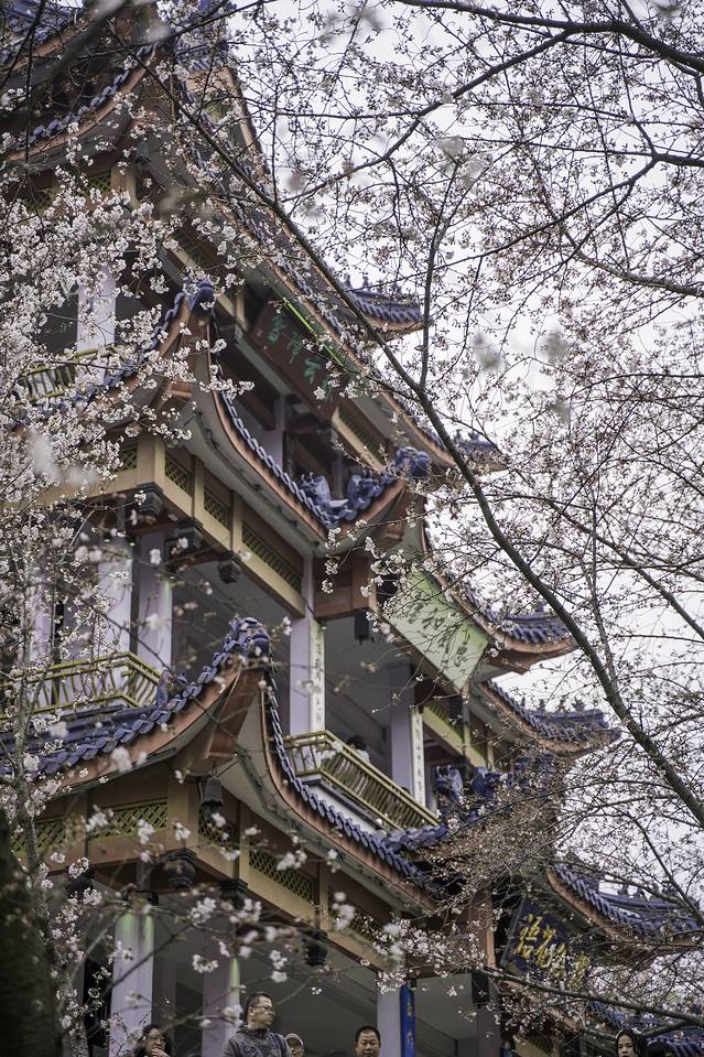 赏樱楼是整个樱花谷的核心地带,也是樱花谷的标志性建筑景观,古色古香的建筑风格,廊檐飞翘,飞阁流丹,即使赏樱楼周围的樱花还未完全开放,但如今呈现在我眼前的景象就足以惊艳。