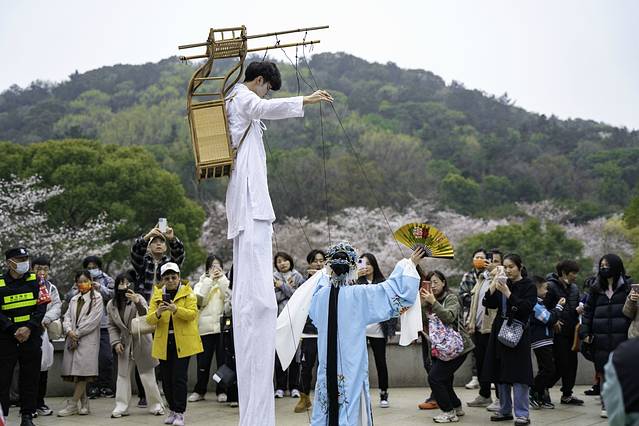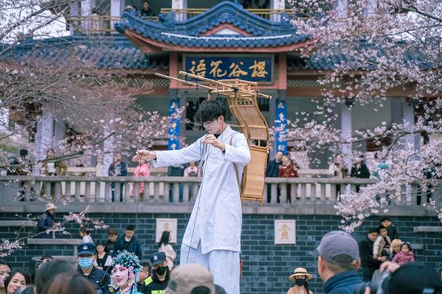 来到樱花谷,不仅能欣赏到美丽的樱花,还能看到与众不同的快闪表演。来到赏樱楼前的广场,只见一位身着古装的男子踩着高跷背着竹篓,而在他的身旁则是一个戏服装扮的女子,男子通过提线控制着女子的动作,就好像是提线木偶一般。整个表演,非常的别出心裁,给人满满的视觉冲击。