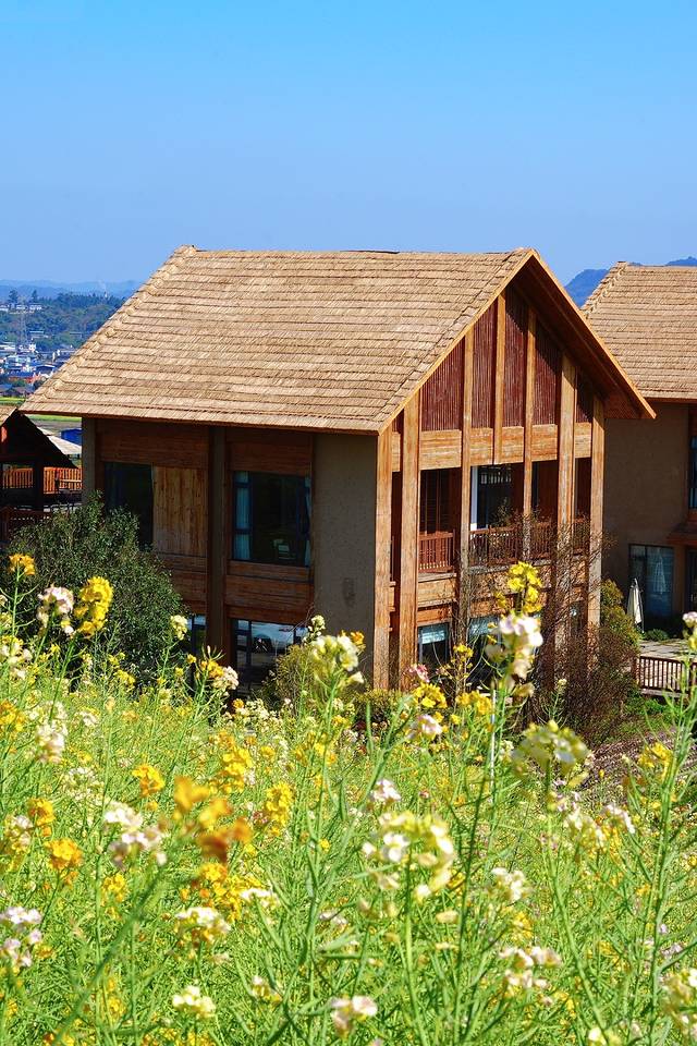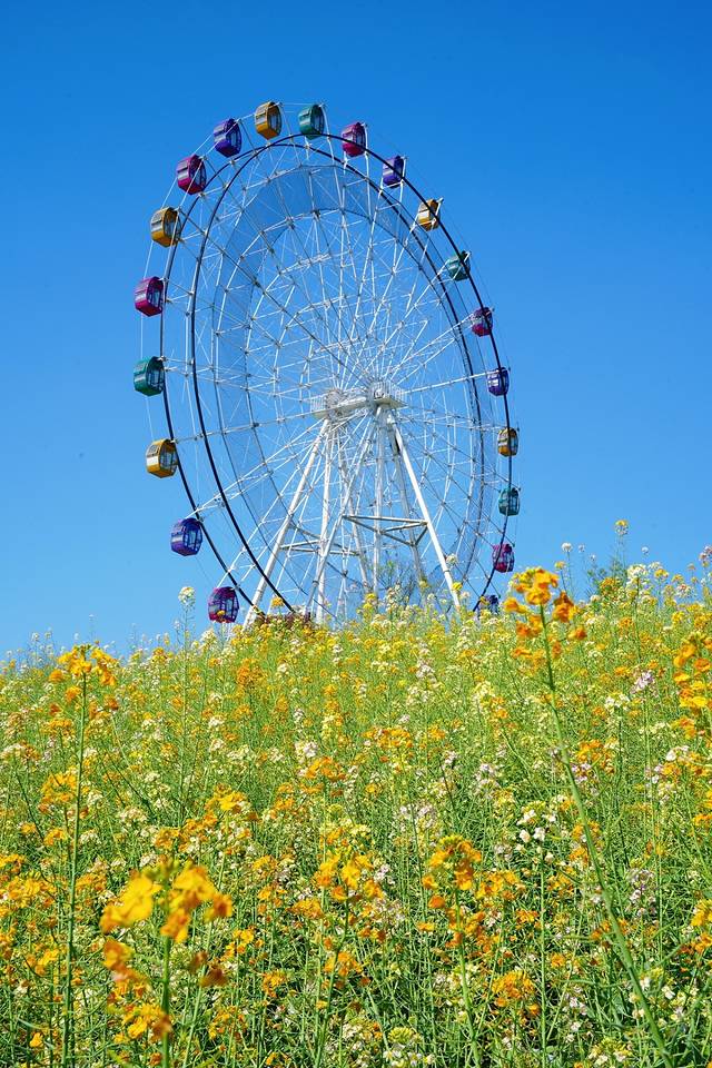 山间有木屋别墅,可以供等待花期的游客停歇,巨大的摩天轮承包了小孩子们绝大部分乐趣,风儿旋转,带走花苞刚吐出的清香,田园的闲适也随手送到了你的身旁。