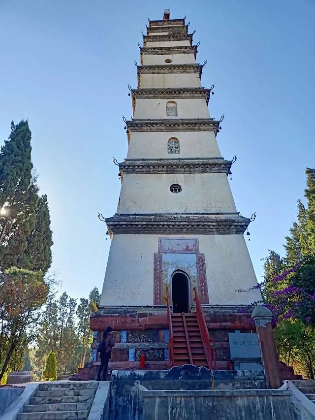 会理文塔(白塔)矗立于城南3公里左右的白塔山,始建年代不详,清道光二十四年(1841年)重建,距今已有176年历史。塔倚山起势,山以塔而得名,无论从什么方位进入会理或在会理城,都可以看到苍翠峰峦之巅高矗的白塔。文塔与会理文化教育的兴起与发展相关,清道光年间会理地方人士认为“县城南隅空洞、一望平芜,东南方文峰不起,宜矗秀峰”,希望以此振兴文教,培植人才,“人文蔚起,冠盖蝉联,如塔之层累以上也”。会理知州何咸宜于清道光二十一年(1841年),委官绅筹资重建文塔 ,历时3年方建成“塔层九级,高约十丈,周广十六丈,塔畔建魁星阁一所”。文塔因其色白又俗称白塔。