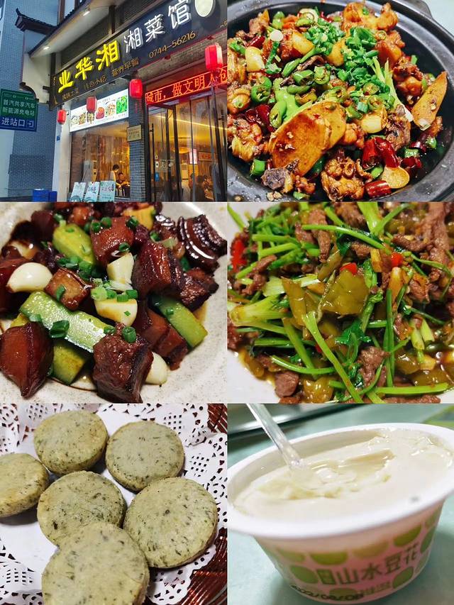 吃饭:【业华湘湘菜馆】武陵源桂花路店。考虑选了离酒店不算太远评价还可以的湘菜馆,味道在景区周边大环境比较好的一家餐厅。份量很多,量很足,湘西土匪鸡还可以再耙点,毛氏红烧肉,味道还可以,肥的也不太腻,野山椒牛肉不错,野山椒不是很辣,老年人觉得很下饭,蒿子饼外脆内软,口感很好,张家界山水豆花个人觉得好吃,绿豆打底,清爽解暑,但在超市没看到有卖的,上菜飞快,服务特别好,价格也不算贵,很推荐的一家餐厅。