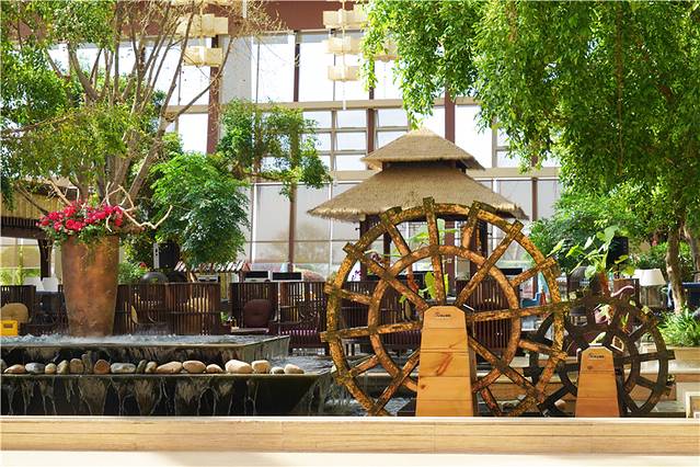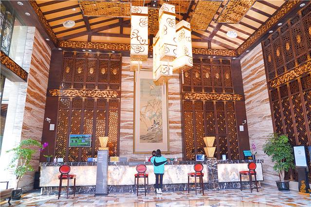 一走进黑龙滩环球融创天堂洲际酒店大堂,现代与原生态完美结合。金碧辉煌的吊顶,水车、稻草亭的大堂,都看出了设计者的用心。