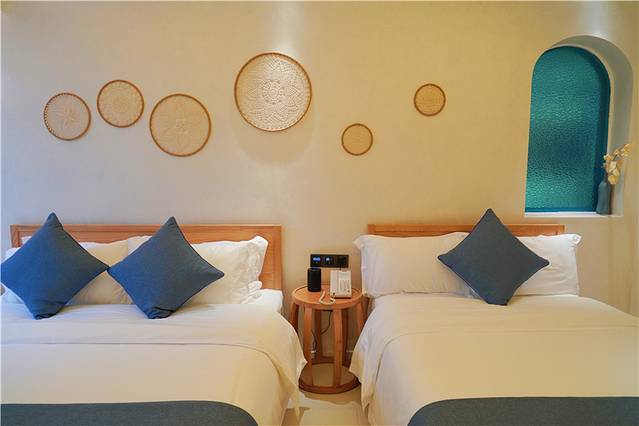 华凌山庄·隐湖栖的房间各有特色,我们参观的这间房,有 地中海 的味道。以田园风情和柔和色调装饰,温馨典雅。