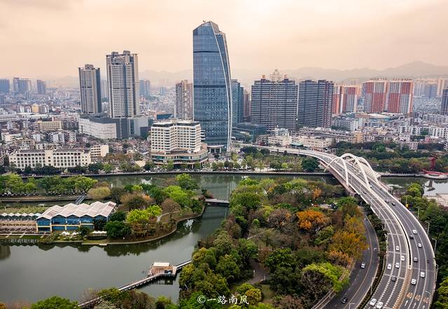 从高处看,岐江公园就像漂浮于水面上的一艘船,这里绿意盎然,繁花似锦,和中山市的城市景观互相映衬,美出了时尚格调。