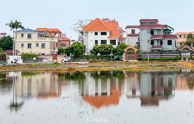 此时,上一季的稻谷早已经收割,新一季的秧苗还没有插,稻田里放满了水,清澈的水就像一面明镜,将别墅、花木和乡村小道照出镜像效果,让人想起《走在乡间的小路上》《乡村路,带我回家》和周杰伦的《七里香》,虽然天气不是很好,但整个视觉影像依然有油画意境。