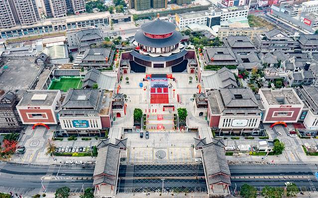 中山红博城全称中国(大涌)红木文化博览城,坐落在中山市大涌镇的核心区域,整个建筑群就像一座雄伟典雅的古代宫城,主建筑特别像天坛祈年殿,看起来非常气派。