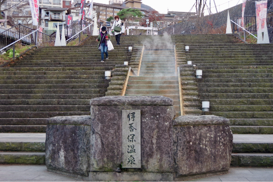 提到伊香保温泉,就不得不提到代表性的伊香保温泉街——石段街,共有365个台阶,通往伊香保神社,街两边坐落着各种温泉酒店,是伊香保温泉的象征。石阶中间是从山上流下来的温泉水,热气腾腾地冒着白雾,伸手摸一下温暖又顺滑。